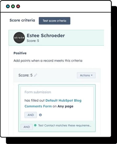 Once you are happy with your lead scoring criteria it is recommended that you test a contact. Simply click ‘Test score criteria’ and choose a contact record.